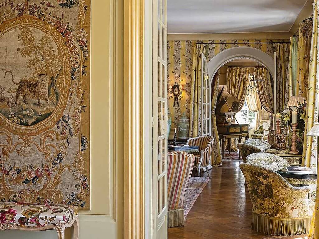 Broccato Luigi XVI, interni esclusivi nelle tonalità del giallo. Pareti e tendaggi stile classico in moiré stampato di cotone. Rivestimenti coordinati per rendere caldo e prestigioso il living.