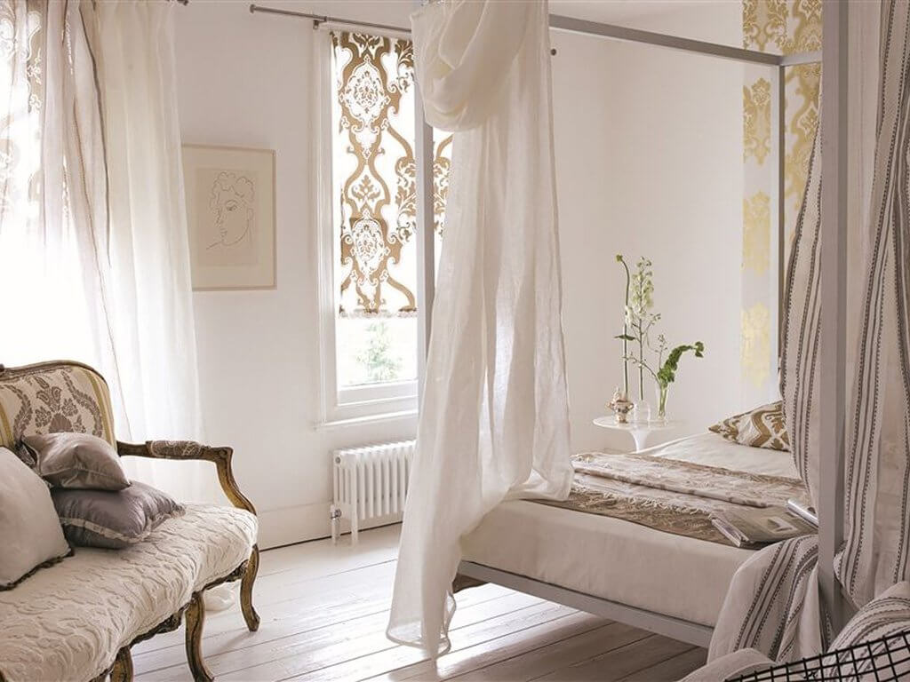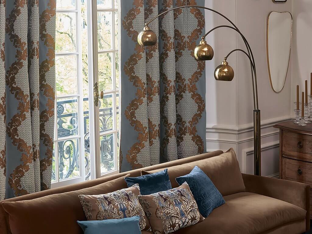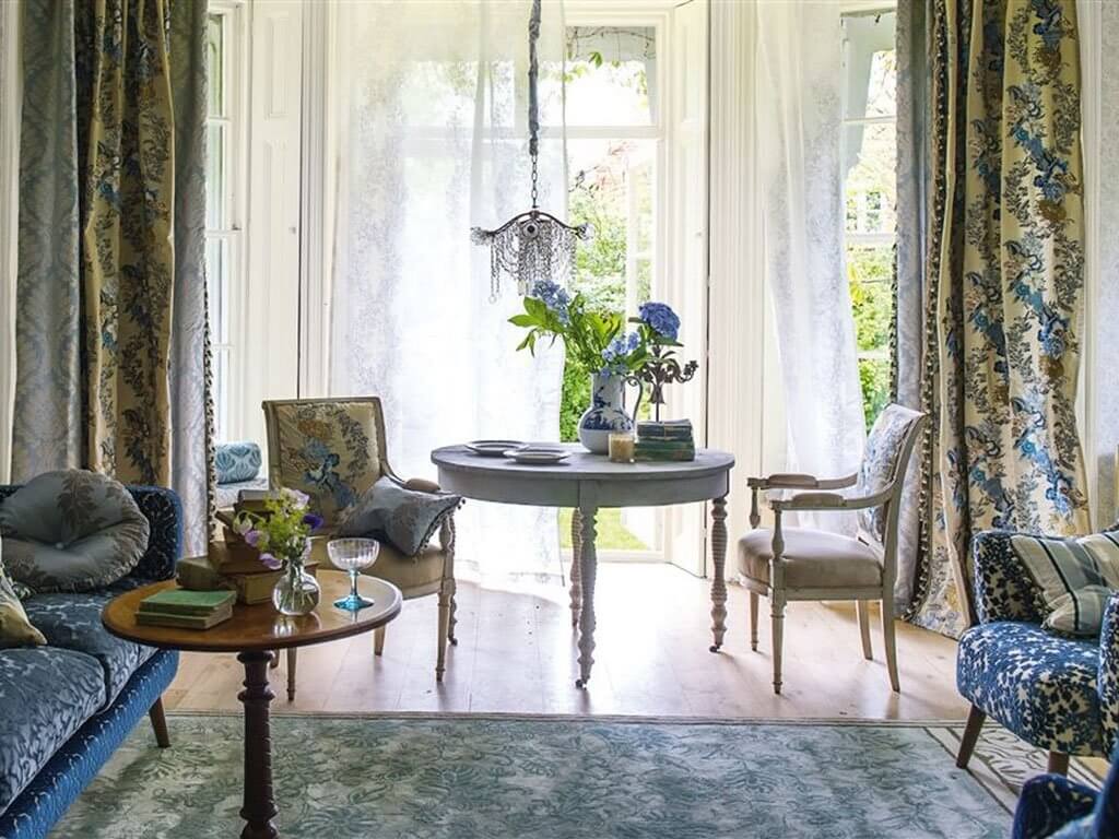 Ambiente country chic arricchito con tendaggi in lampasse in seta, tessuto pregiato affine al broccato.