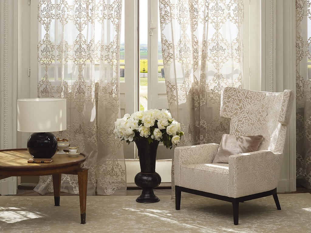 Preziosa tenda in seta trasparente con ricercati disegni in rilevo. Stile e classe intramontabili.