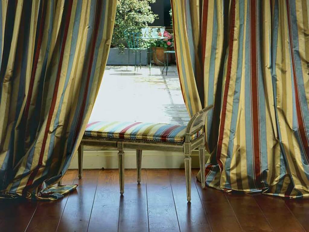 Raso di seta con ampie righe in quattro tonalità di colori cangianti e particolarmente brillanti che donano vivacità all’ambiente. Uno stile classico ma al passo coi tempi.