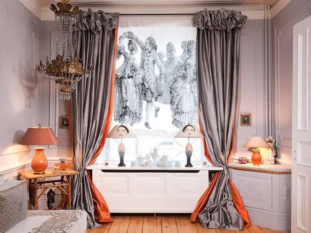 Elegante boudoir in stile classico nelle nuance del grigio e arancione. Tende chiffonées in taffettà di seta.