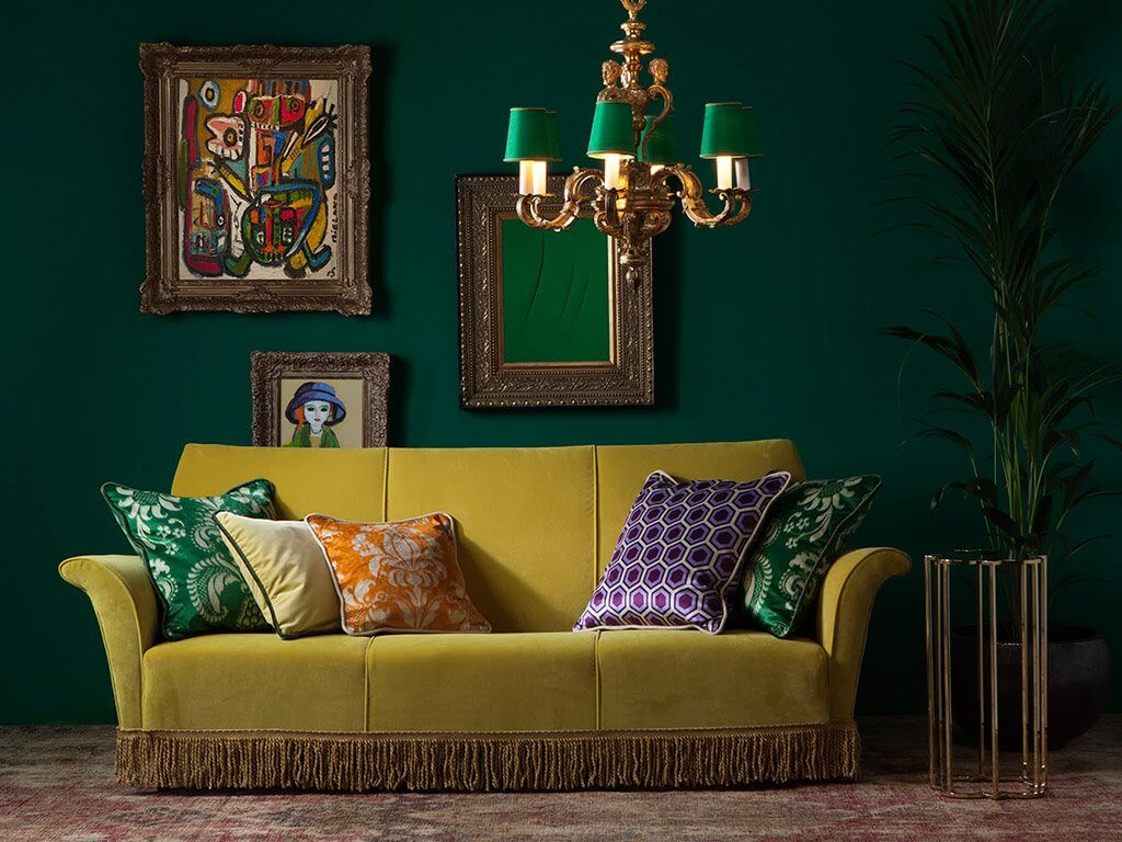 Divano in velluto di cotone rifinito con passementerie arricchito con cuscini in seta. Ricca tavolozza di colori e varietà di motivi geometrici e floreali.